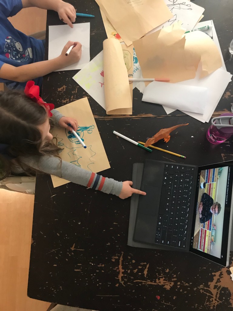 Art For Kids Hub was a favorite with both of my boys. It’s an adorable family channel available on YouTube Kids (which we signed up for during this time as well). The dad often (usually?) sits next to one of his children and they draw side by side. The results are pretty advanced considering they’re intended for kids & considering that I never learned to draw anything so it seems particularly difficult to me!