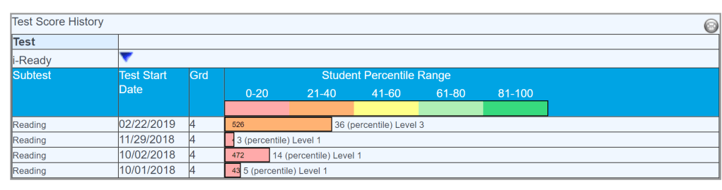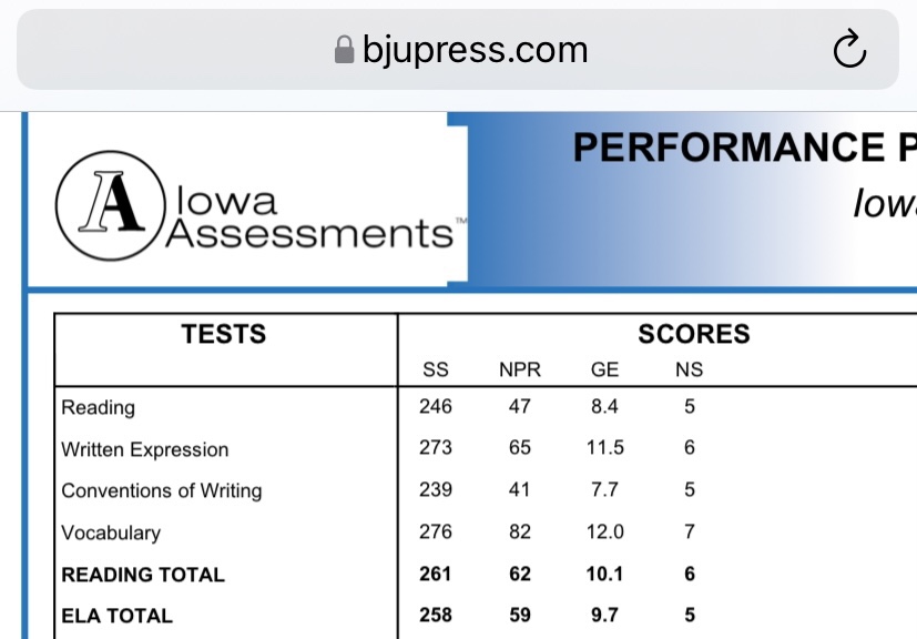 This is the detailed report from her June 2019 (end of 4th grade) assessment: