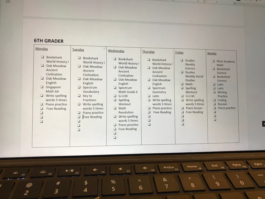 The last tool that I use has been a huge help for me and the children. It sets out clear (and very minimal honestly) expectations for what they are expected to complete each day. I do not set any time constraints. The only limitations they have for when work must be completed by is if we have outside of the house commitments, like soccer practice. And yes, I have had kids finishing work in the minivan on the way to soccer practice, omg.