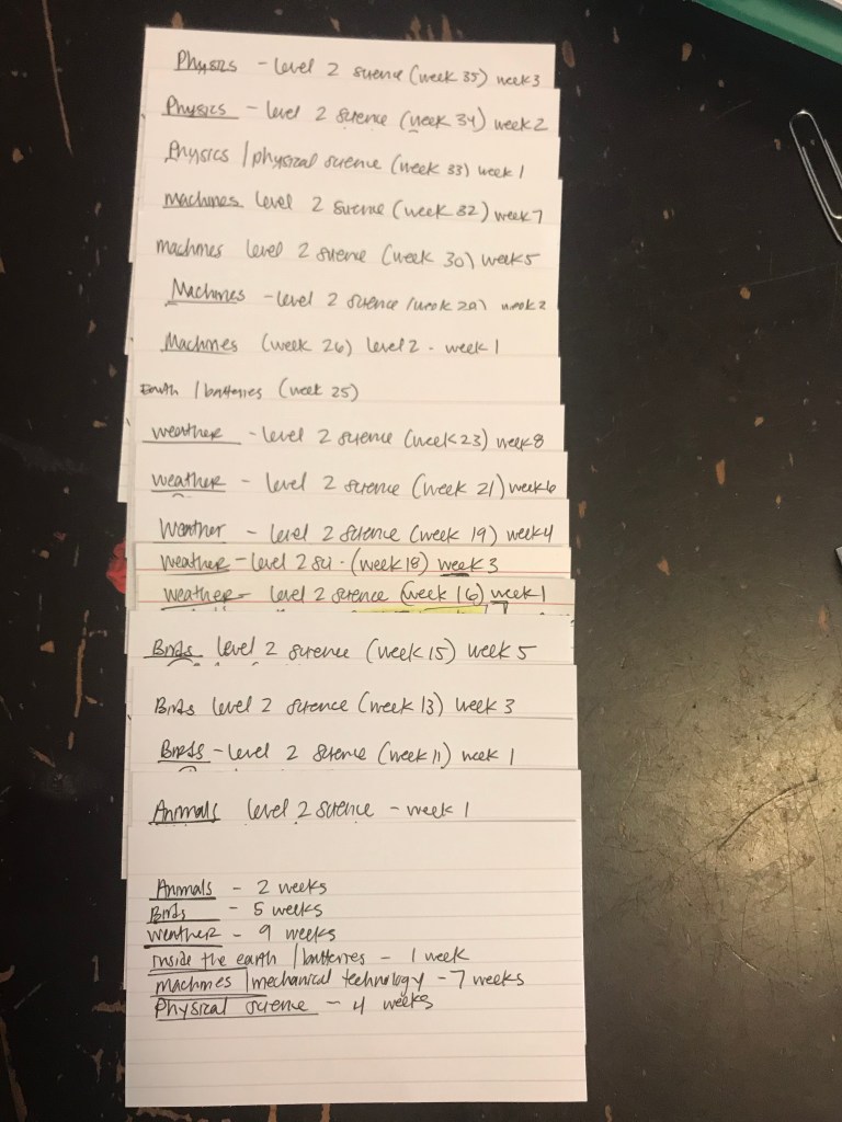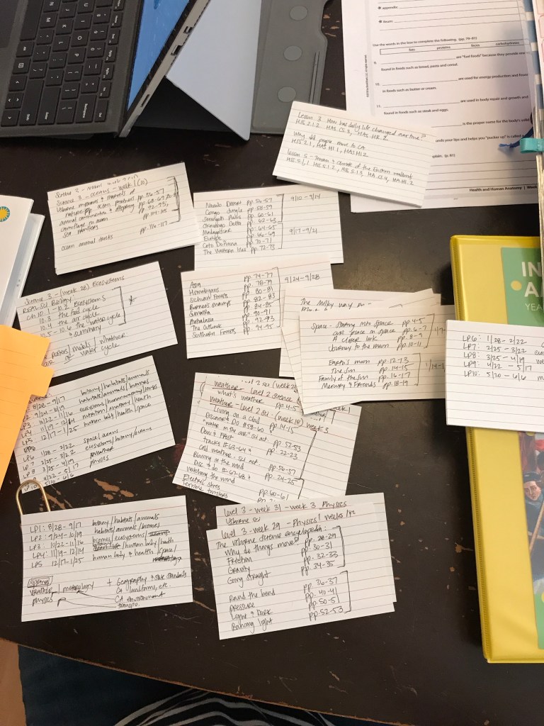 Here’s how it works: you take index cards, and you write all the things in a week on them. What are all the things? Any outside the home commitments (how sad during this particular time, amiright?), regular activities, and school subjects or tasks that you want to include within your day.