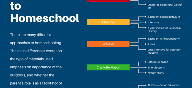 A blog post explaining the differences between Classical, Charlotte Mason, Unschooling, TJED, Socratic, and other approaches to homeschooling.