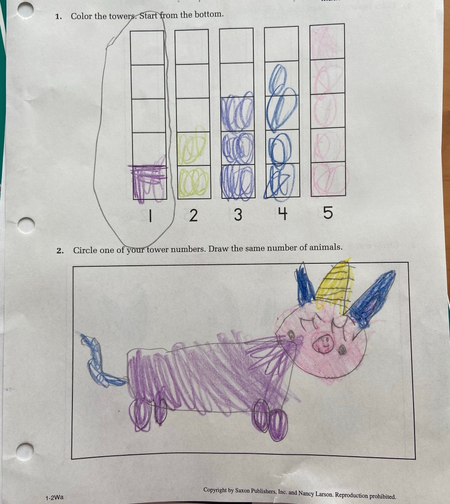 Saxon Math 1 — Saxon K does not have workbooks, so 1 was a better fit. If you’re unfamiliar with Saxon, it incorporates a lot of review, which is why it isn’t too advanced for my 5 year old.